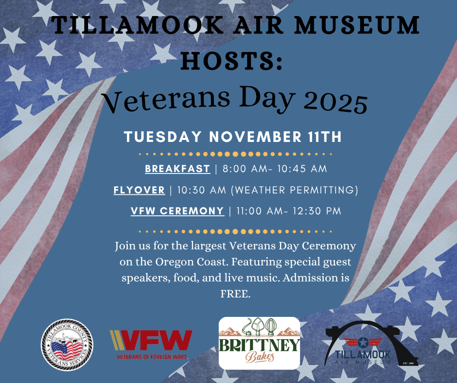Join us for our annual Veterans Day event featuring breakfast hosted by Brittney Bakes, ceremony, and Air National Guard F-15 flyover. The Veterans Post 2848 is the main host and is placing a special focus on the crucial roles of military service animals and their dedicated handlers, celebrating their bravery and indispensable contributions to our nation's defense. Please join us for a day of gratitude, remembrance, and community connection.